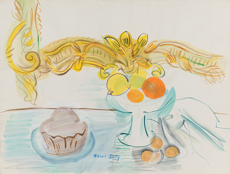 Within his highly distinctive idiom, which delights in introducing multiple graphic signs to punctuate space and does not hesitate to incorporate elements more readily associated with decorative language, Dufy offers us the joyful presence of this Still Life with Brioche and Compotier.
